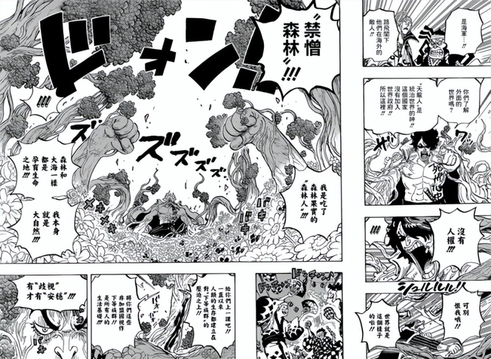 在这一话之中,海军大将绿牛独自一人就闯入了花之都,结果被赤霄九侠,以及大和给挡在了花之都外围。在见到赤霄九侠之后,绿牛算是展现了自己的强大能力,也就是自然系的森森果实能力,直接创造出了一片森林。