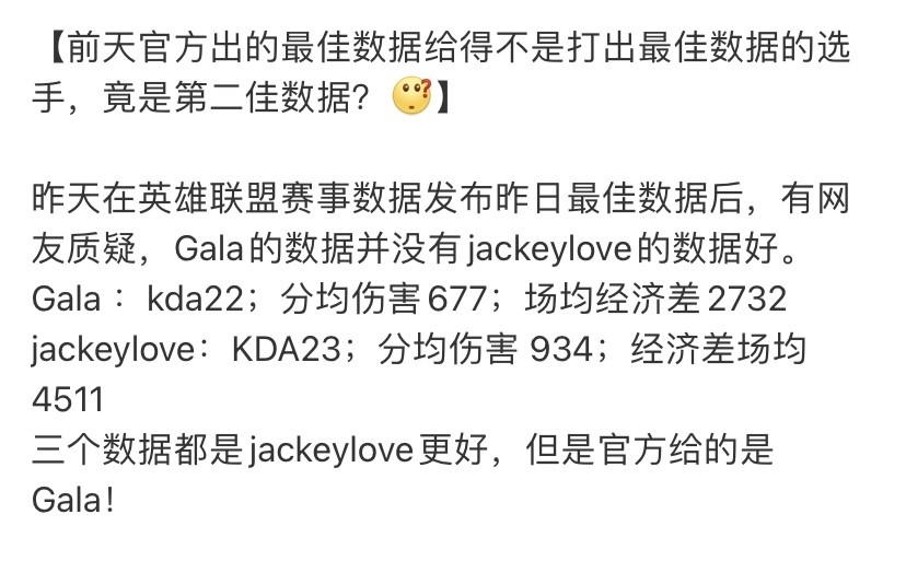 从这三个数据来看,Jackeylove的数据都要优于Gala,但是官方却没将数据给到Jackeylove,这让TES的粉丝感到有些不满。