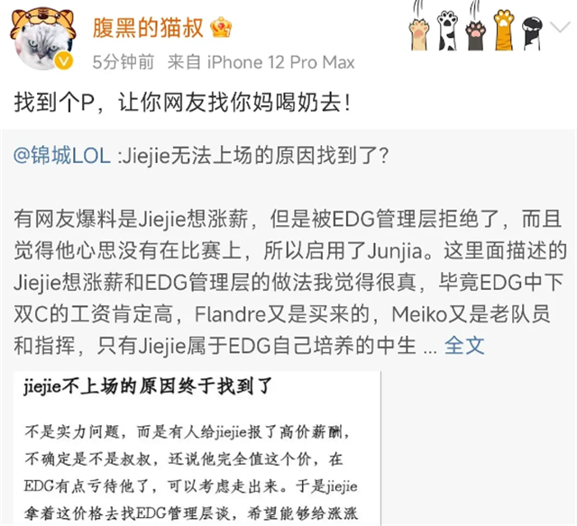 因为最近EDG轮换打野,jiejie成为替补,junjia首发上场。战队成绩不太好,轮换是正常的。但是EDG状态没什么起色,又有人猜测:jiejie可能想离队,或者有队伍给他更高的年薪,选手找EDG管理层想涨薪,被拒之后就不能上场的。EDG工作人员十分无奈,这才发文指责。