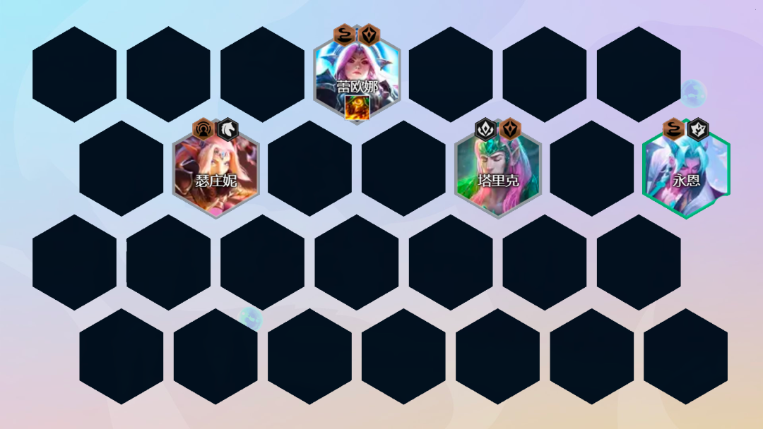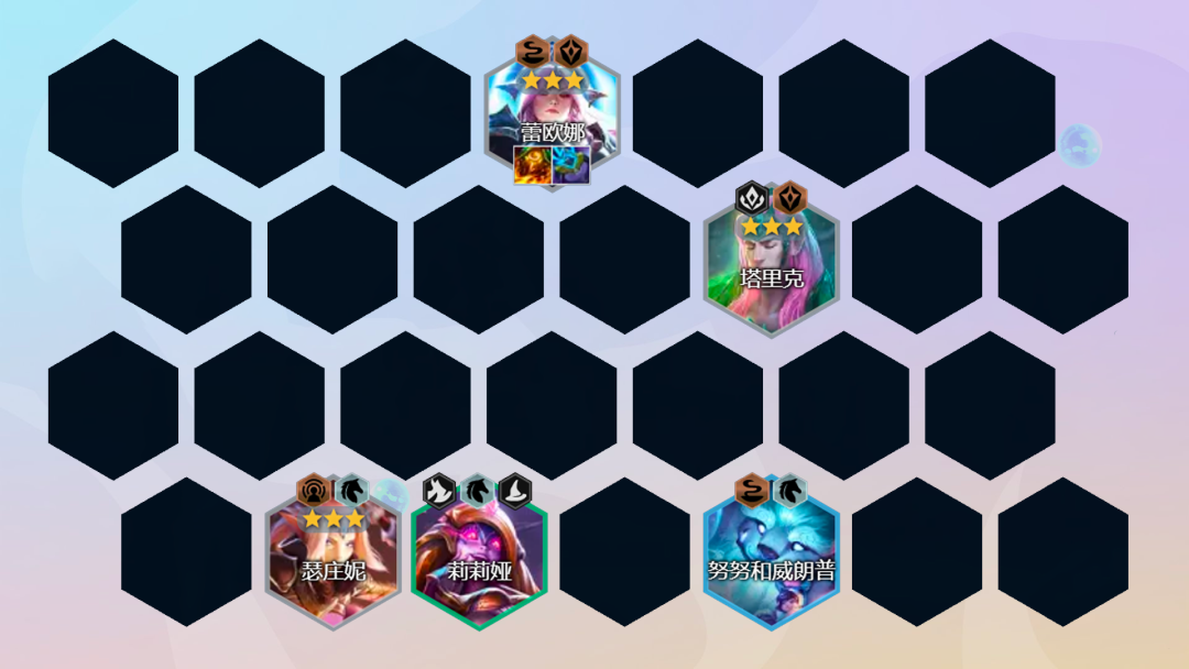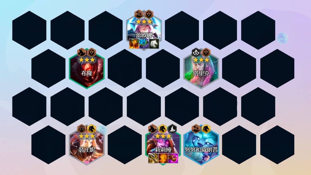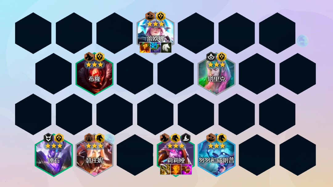 阵容组成蕾欧娜、塔里克、瑟庄妮、莉莉娅、布隆、锤石、努努