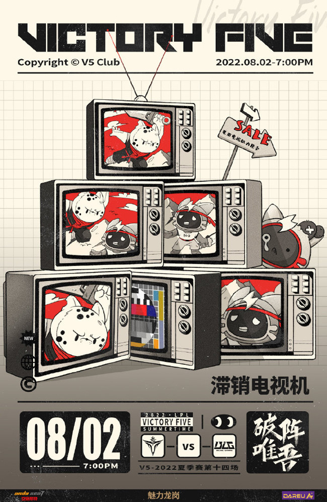 V5的海报标题为“滞销电视机”,五台闭路彩色老电视机中播放的都是小黑豹挥刀攻击电视喵的画面,最下面中间的一台电视机则是“无信号”的彩色电视侧视图。V5在上一周遭遇2连败,虽然早就锁定了季后赛席位,但基本无缘前两名的“双败复活甲”,本场的首发打野仍然是XLB,不知他能否顶住压力,带领队伍成为今晚最后的赢家?