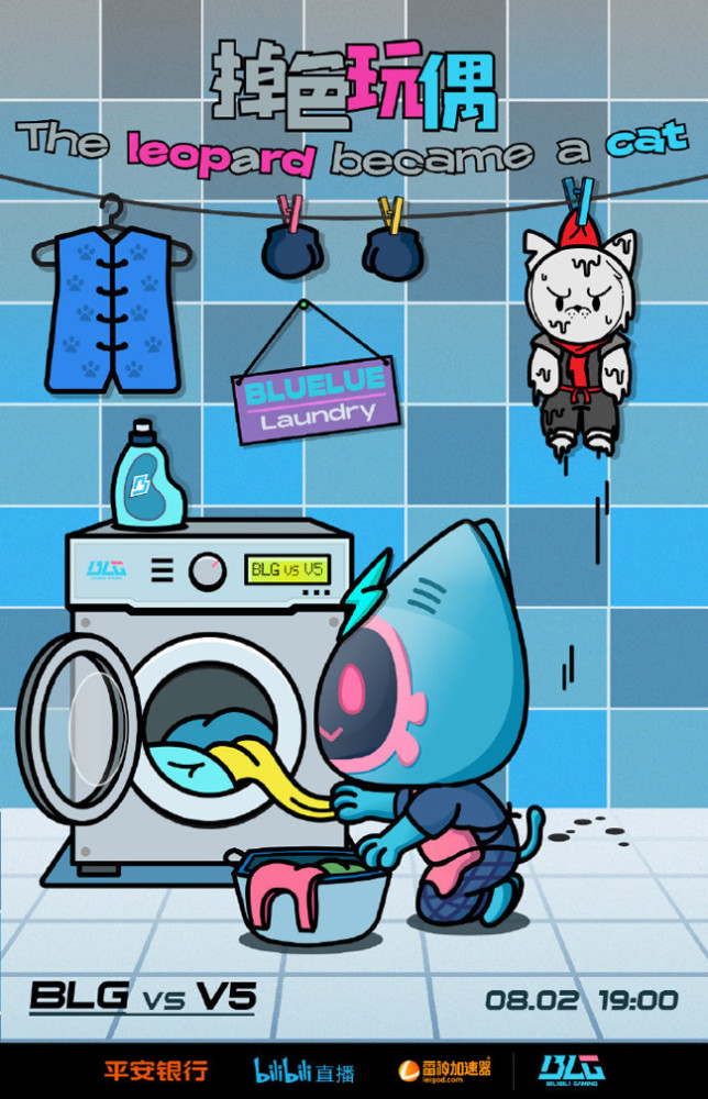 BLG的海报标题是“掉色玩偶”,吉祥物“电视喵”正在洗衣服,右上角的V5吉祥物小黑豹玩偶已经被洗得严重褪色,从“黑豹”变成了“雪豹”~主力AD选手Doggo回归之后,帮助队伍在上一场击败了FPX,只要BLG目前的首发双C和打野保持好状态,他们还是很有希望竞争季后赛的名额。