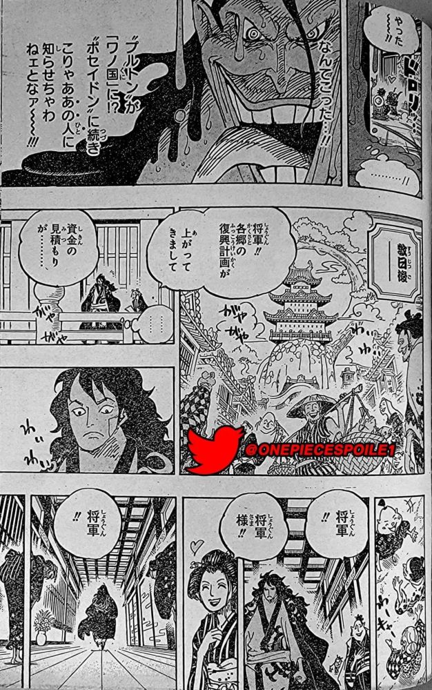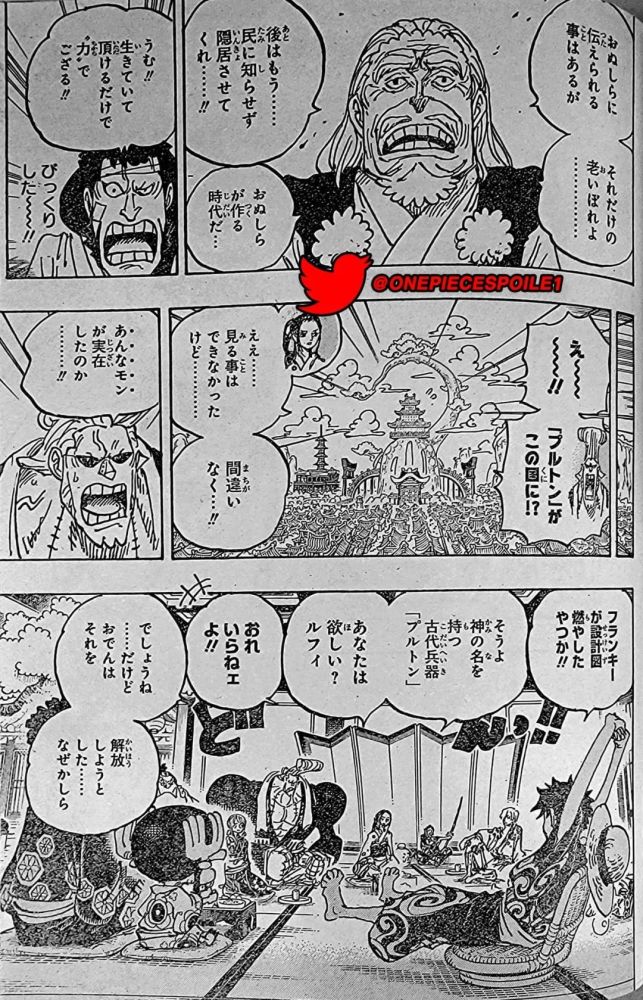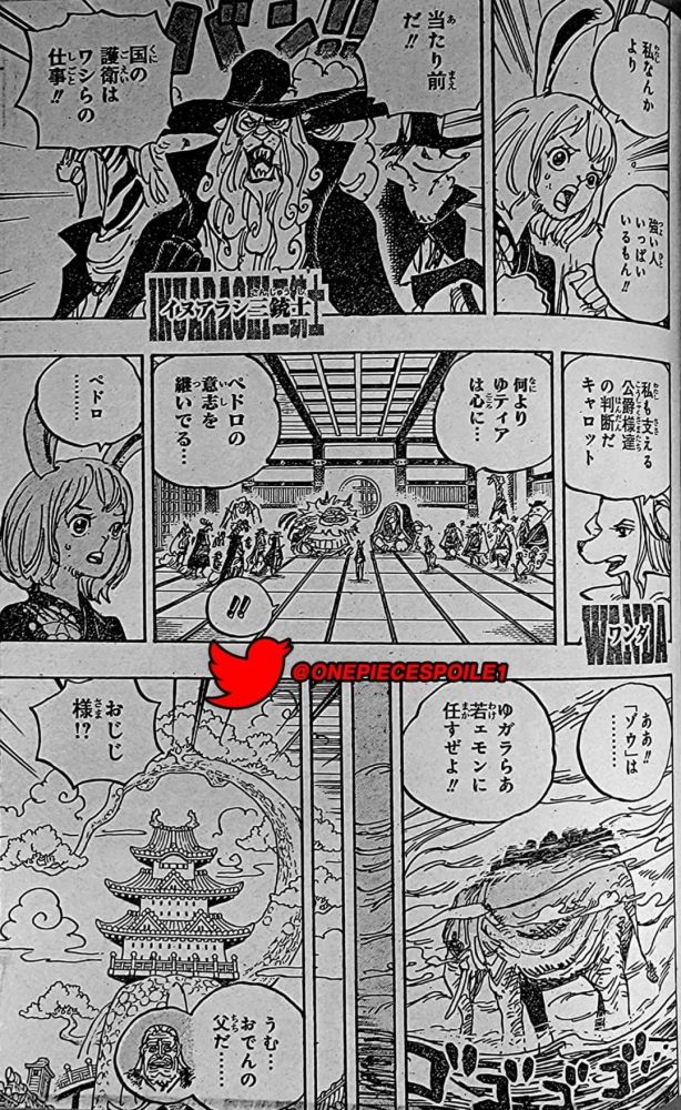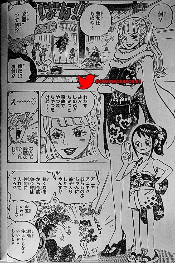 下一幕是草帽一伙。弗兰奇惊讶道冥王不仅存在还位于和之国。路飞记得弗兰奇把图纸烧了。罗宾问路飞是否想要这件兵器,路飞说不要。罗宾说我也是这么想的,但御田为什么想把它放出来呢?他们谈论古代兵器时,瘦身的小忍与阿玉出现了,小忍问他们在说熟女是兵器吗。阿玉摆着忍者的姿势,告诉路飞说她已经成为小忍的徒弟,让路飞在她下一次变得更强的时候招她成为伙伴。娜美跑去拥抱她,说真可爱。路飞答应道只要她会忍术他就同意。卡里布偷听到了冥王的消息,说必须告诉“那个人”。
