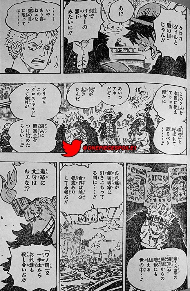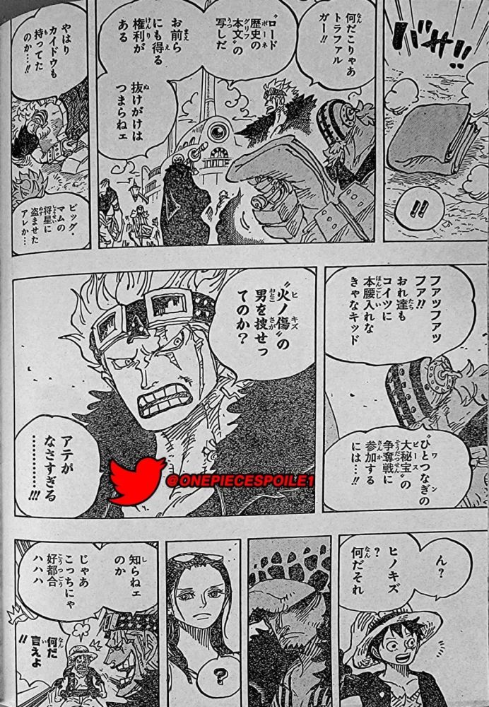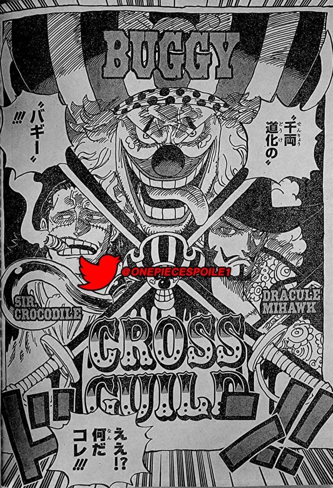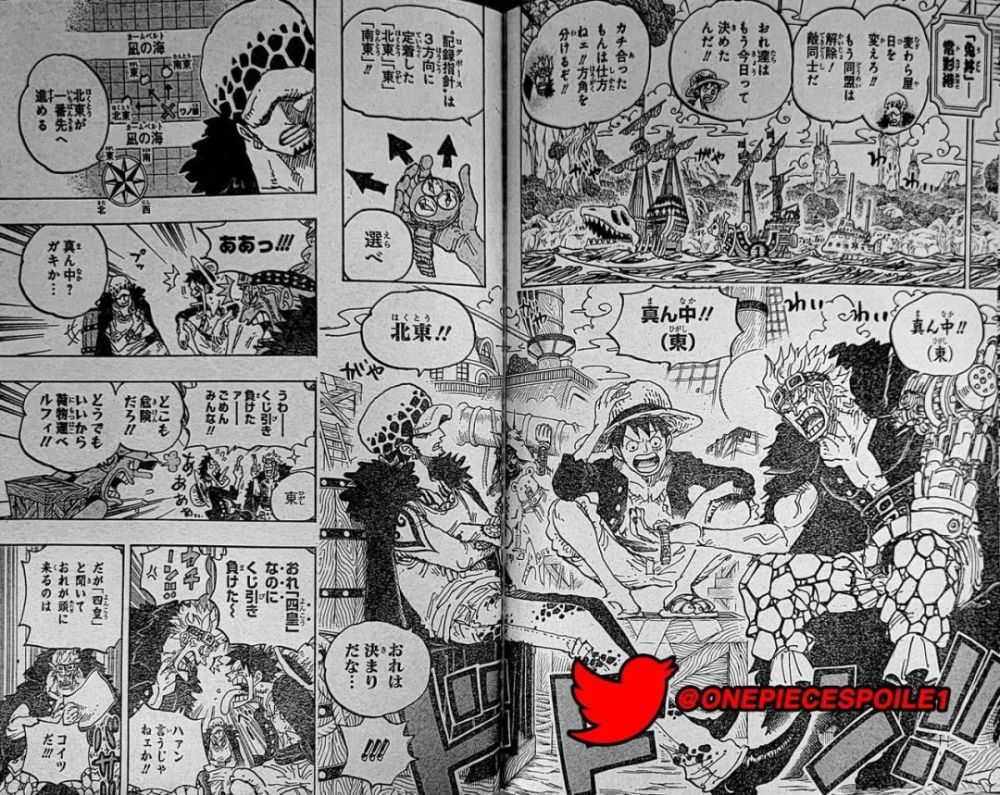 路飞、基德和罗在港口,罗劝路飞改天再走,路飞坚持说他们已经决定今天走了。基德说要是他们碰巧选了不同的出航路线也没办法。记录指针分别指着东北、东、东南三个方向。基德和路飞:中间那个(东)!罗:东北。基德和路飞认为选中间那个会领先最多,但实际上领先最多的是东北方向,罗为此嘲讽二人。他们决定走不同方向,于是基德和路飞抽签看看谁向东走。基德赢了,路飞说即使做四皇他也输了,基德有点火大,但他接着说他唯一不能接受的四皇是巴基。下一页是一张巴基、老沙、鹰眼组成“十字架公会”的报纸。路飞很吃惊,为啥看起来他们像是巴基的小弟。索隆看向他们,说他不相信,特别是对于鹰眼。罗说道如果巴基能让这两人听从他,称为四皇也不为过。路飞回应说巴基只是个傻瓜。基德透露十字架公会的信息,他们貌似对海军颁布赏金,让海军对平民也可能追杀他们感到害怕。罗给了基德一份路标历史正文的拓本,说他们也有权拥有这个。基拉坦言参与OP的争夺战,也必须对此重视。基德问基拉是不是想说他们要找到带有“烧伤印记”的一个人,目前在哪没有任何线索。路飞对这件事很好奇,罗宾和罗也感兴趣。基德没有告诉路飞,说这是为他好。
