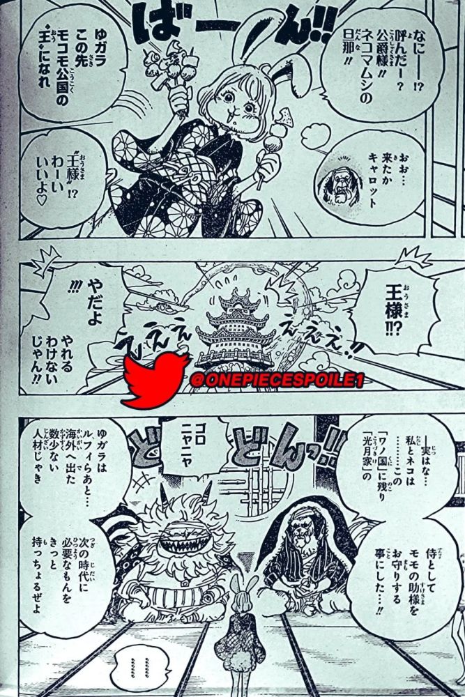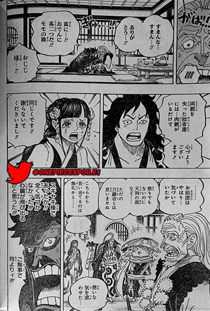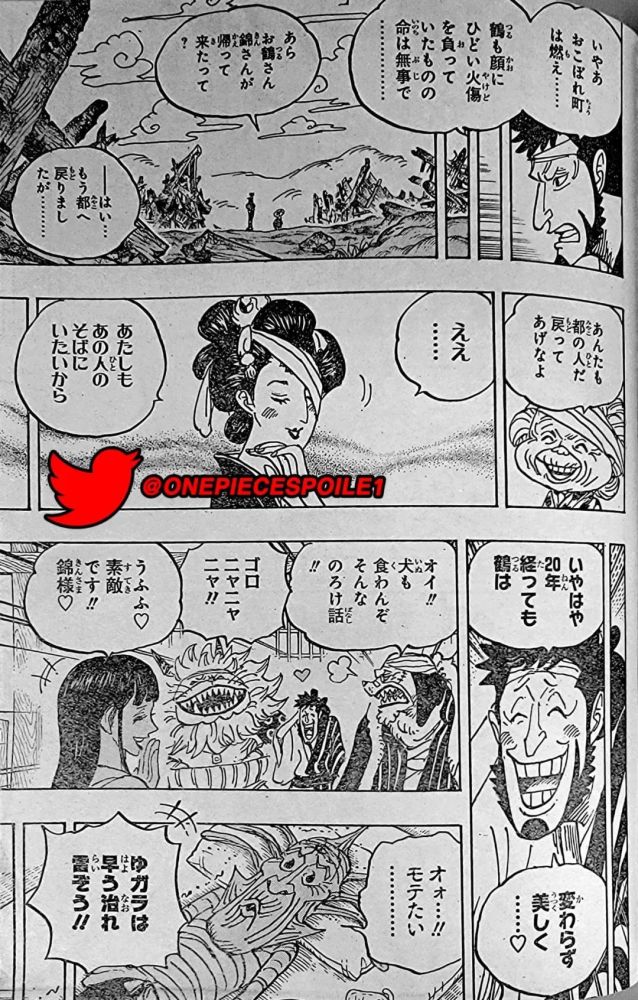 宴会已经结束,小忍和雷藏一副营养不良的样子躺在床上,赤鞘们鼓励他们坚持。赤鞘武士们接受了绿牛的说法,认为凯多确实是让外敌远离和之国的一种威慑。锦卫门为战斗发生时他正和阿鹤待在一起而道歉。猫蝮蛇告诉他不必担心,在桃之助的努力下损伤已经降到了最小,并问到阿鹤的伤情。锦卫门答道她的脸严重烧伤,好在无生命危险。我们看到阿鹤正在与阿蝶老人谈论锦卫门的回归,她说锦卫门已经去了都城,她也想去都城陪伴锦卫门。锦卫门脸红地说,她就像以往一样漂亮。犬岚说这也太甜了,甚至对于狗狗也是如此,猫蝮蛇大笑,小菊说真可爱。躺在床上的雷藏说他也想受人欢迎。
