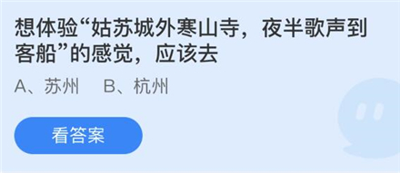 蚂蚁庄园8月5日给大家带来了问题:【想体验“姑苏城外寒山寺,夜半歌声到客船”的感觉,应该去?】,寒山寺其实就在苏州的姑苏区哦,那么接下来小编带来了今日的答案,一起和小编来看看吧。