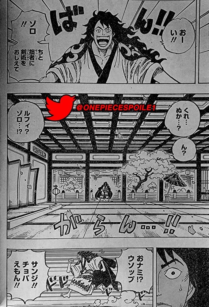 桃子高兴地打开一扇门,想叫索隆教他一点剑术,但发现屋里空无一人。他开始在城堡里上下奔跑,按照草帽团上船的顺序喊了各人的名字,最后喊了大和的,但他找不到他们中的任何一人。