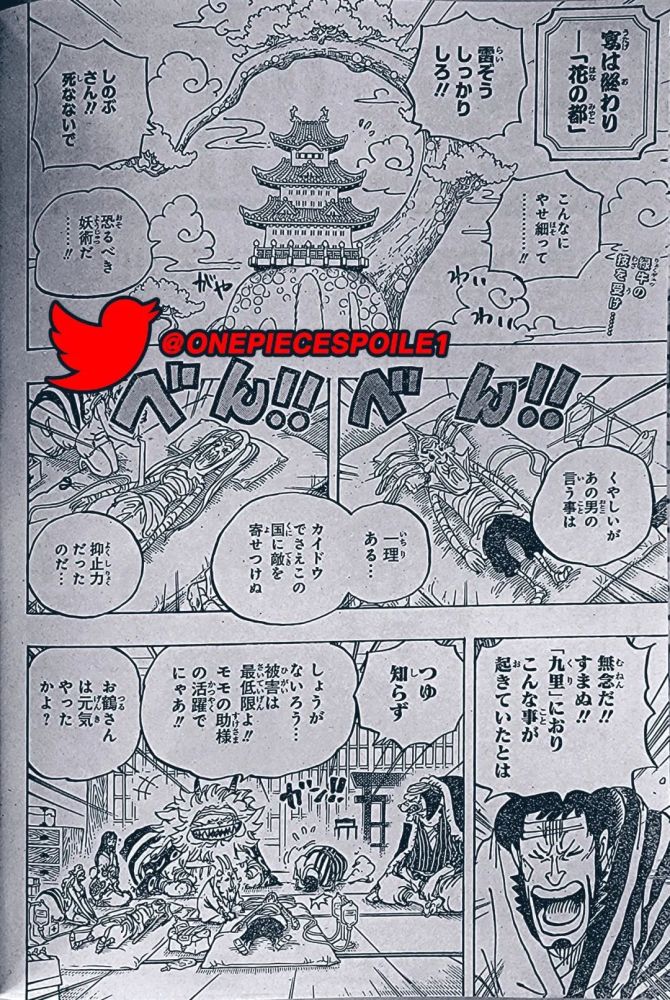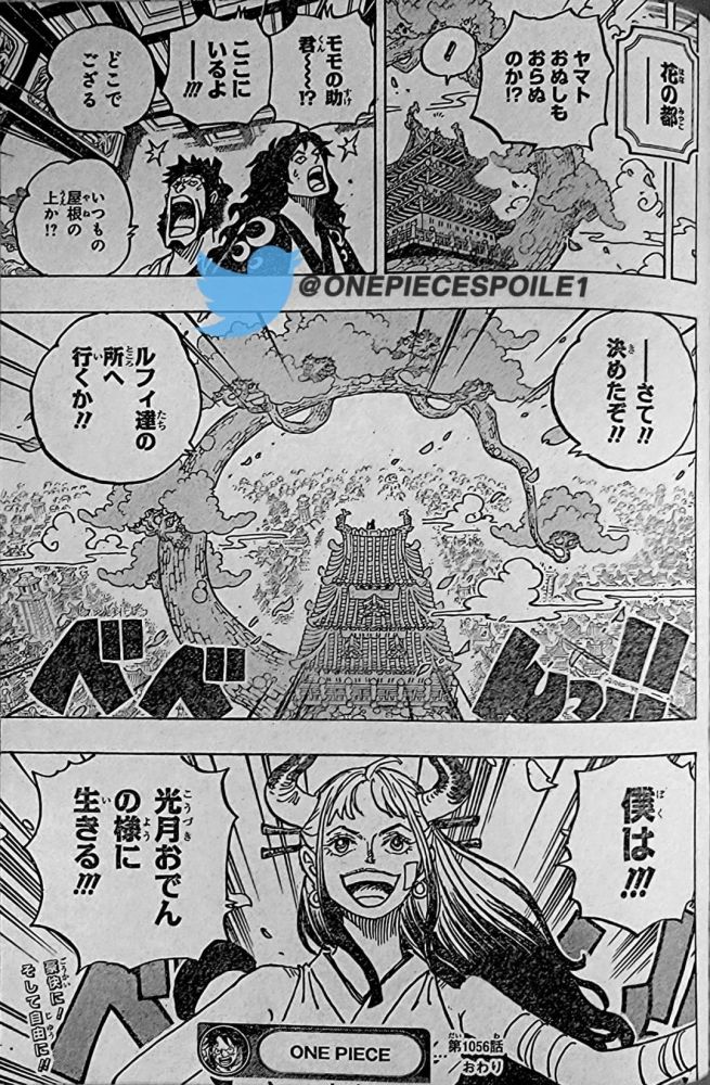 本话结尾是桃子大喊着问大和是不是也离开了,但大和正在屋顶上,对着桃子喊她该跟着路飞走了,是时候像光月御田一样活着了。