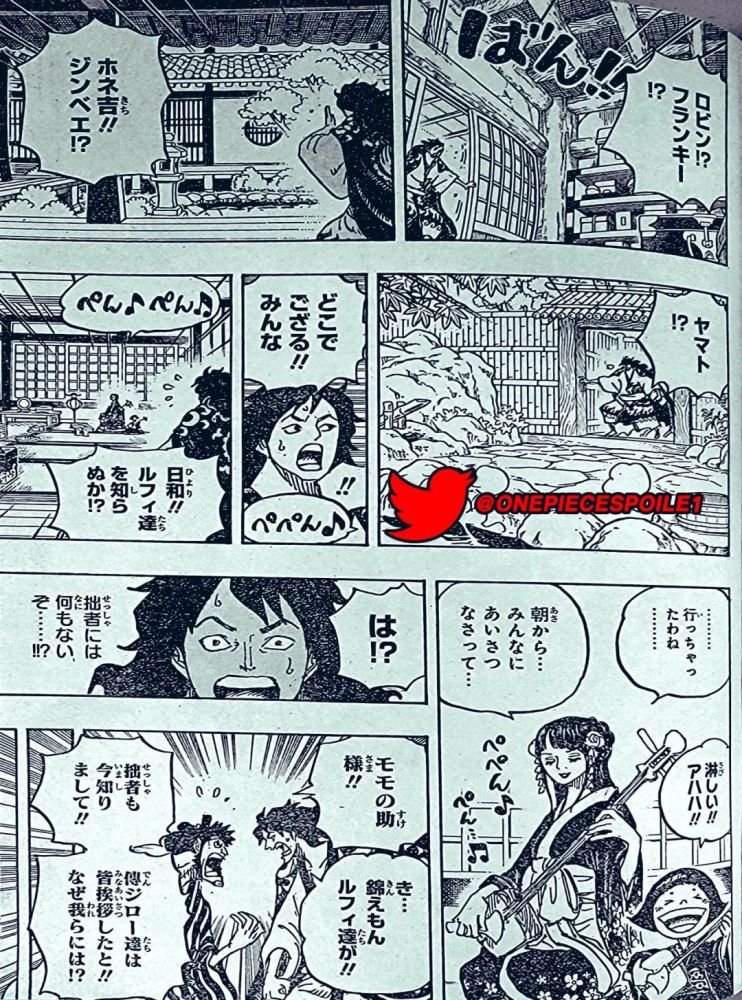 最后他找到了正在和小南子一起弹三味线的日和。桃子问她路飞他们在哪儿,她说他们在跟大家道过别后已经走了。