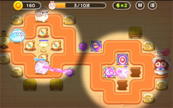 第2波过来前的空档期,魔法球和导弹塔集中清掉上面的障碍,打完1个把灯塔打一下,然后接着打兔子,这个时候如果金币足够可以先把这2个炮塔升满。3级导弹塔打前面2波的兔子是很稳的。