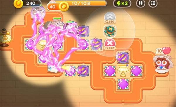 3波以后基本上都是重复的,导弹塔的数量能提就提,是打风筝兔的主力,这关的风筝兔比较多,然后魔法球布置在中央,就能覆盖周围的火力。冰冻兔操作上面能力足够的话可以控制下,尽量让它在炮塔少的地方死,没时间的话如果冻住了炮塔就要尽快打开。
