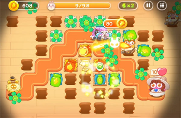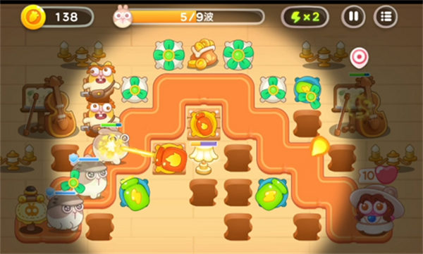 第3波开始会有捣蛋兔,地板会出现空的,及时把炮塔附近的空地板补上,不然等捣蛋兔把炮塔带走哭都来不及。捣蛋兔出来后,也是尽早集火打掉,不给它带走炮塔的机会。因为同时还有速度较快的滑板兔,对自己操作不自信的小伙伴可以暂停,补地板,集火兔子。