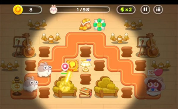 开局可以在灯塔的左侧建个2级火瓶子,用剩下的钱在上方建个风扇,前期金币不多,让火瓶子集中打沙发挣钱,风扇在打兔子的同时还能顺便清建筑物障碍,但是风扇攻击力有限,可能会有漏掉的兔子,如果有漏网的兔子,火瓶子记得补一下。打掉沙发以后来金币了,先升级风扇,趁着空隙把灯所有打亮,然后继续打沙发。