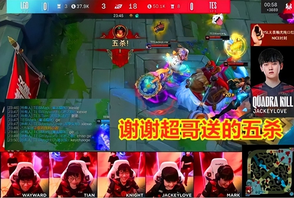 在第一局的最后上高地阶段,Jackeylove的希维尔拿到了四杀成就,LGD只有Haichao存活。这个时候,Haichao主动出了泉水,送给了阿水一个五杀。TES全队在公屏上,高呼“xiexie Chaoge”。至此,JKL选手,成为LPL赛史上首位,在连续两场比赛中,都拿下五杀的选手。