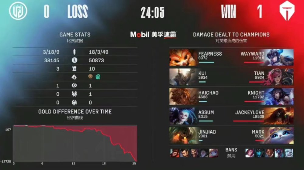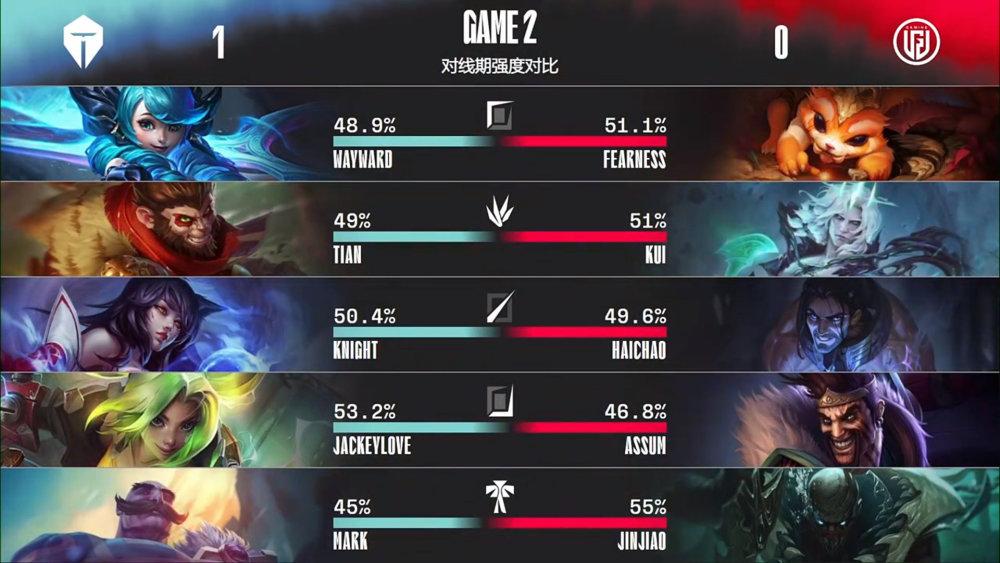 第一局比赛,LGD蓝色方,禁用波比、塞拉斯、德莱文、赵信、猴子,选用fearness纳尔、Kui潘森、Haichao岩雀、Assum金克斯、Jinjiao泰坦;TES红色方,禁用剑姬、卡莉斯塔、卢锡安、巨魔、佛耶戈,选用Wayward瑟庄妮、Tian蔚、Knight阿狸、JackeyLove希维尔、Mark悠米。