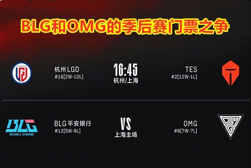 而在8月5日的比赛,由杭州LGD迎战TES,以及BLG平安银行大战OMG两场比赛组成。其中TES和LGD的比赛,由于TES已经是常规赛的TOP2,他们争的是复活甲;而BLG和OMG的比赛,对于两队而言,则是至关重要的比赛,谁输谁就无缘季后赛!