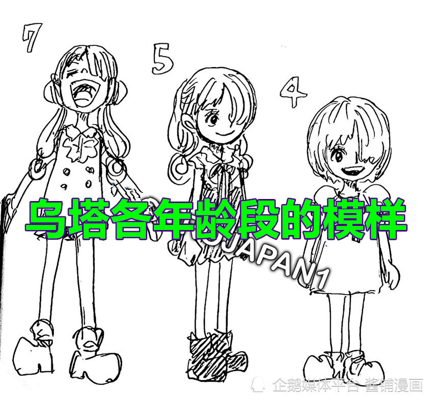 除了恶魔果实的秘密之外,尾田还提前公布了乌塔各个年龄段的形象, 分别有4岁,5岁,7岁与9岁。