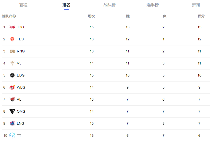 目前在前四的队伍里面比赛场次最少的是RNG和滔搏,两支队伍全部只打了13场比赛,按照如今积分榜的形势来看,事实上打比赛较少如今反而是一种劣势,因为京东领先进行的比赛,基本上获得了胜利,RNG和滔搏只要稍微犯点错误失败几场,那么在积分榜上的劣势就会变得无限大。而V5接连地输掉几场比赛,已经在争夺常规赛冠军的道路上落了下风,身后的EDG和微博已经早已失去了常规赛争冠的资格。