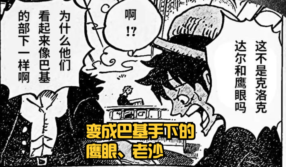 当路飞接过报纸后,才发现失踪多年的老沙以及鹰眼都出现在报纸上,甚至还是巴基的部下(看起来像)。