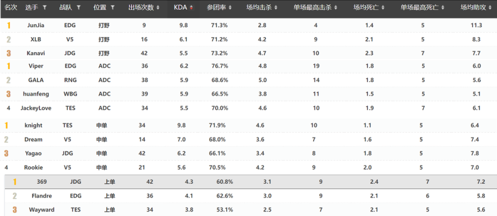 而之所以说JDG被低估,是因为观众们小看了369和Missing。打野Kanavi把把C自然不说;369能在资源倾斜的前提下在KDA端、队伍贡献端都位列LPL第1,不提数据没人知道,Missing同理。因此,笔者认为JDG仍将成为TES夺冠路上的拦路虎,输RNG实在太倒霉了,同样的错误应该不会犯第二次。比较意外的是,XLB和Karsa还真就不是一个风格,两人出场次数55开,Karsa的视野贡献和KDA遥遥领先,XLB则在场均击杀、打伤害能力上远强于Karsa。