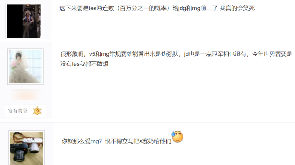 当然观众们意见不一,部分认为MSI新科冠军RNG至少是夏季赛冠军的有力竞争者;另一说JDG和TES是一个档次的队伍,RNG和V5是稍弱一档的队伍,总体实力相近;也有观众认为很形象,即“TES独一档,80%能拿冠军,其他队伍统治力都不够”。特别地,被尊为独一档的TES仅输的一场bo3就是拜苦主JDG所赐,局势变得扑朔迷离。