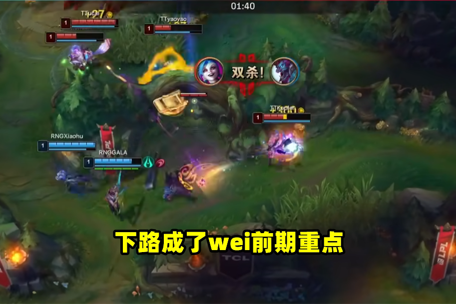 最后再看看RNG如今的打法吧,在对阵TT的最后一场,RNG还是一套熟悉的节奏。小虎拿到岩雀后,岩突的命中率依旧令人震撼,对线完全碾压狐狸,甚至打出了对位击杀。游走gank之时声音也相当大,帮助队友稳住了前期。之所以会这么说,是因为RNG的开局其实并不好,一级团被对面萝莉拿到双杀,wei只能在前期将重心放在下路,帮gala先稳住开局。