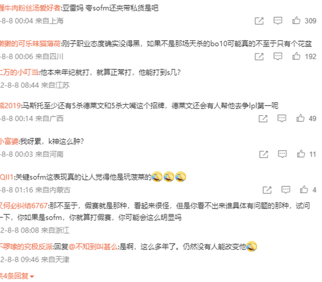 说到sofm他却觉得,这位选手只是太强了才被误会:SofM不会做那种事情,我太了解他了。有的时候玩游戏给人感觉很怪,因为他把对面当“菜”玩了。这都是不好的习惯,自己太强了老把对面当“菜”玩,所以看起来像是“假赛”。