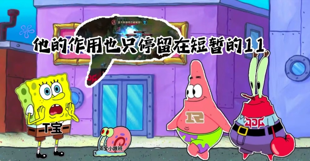 其中海绵宝宝是T宝,然后派大星是RNG,蟹老板则是JDG。
