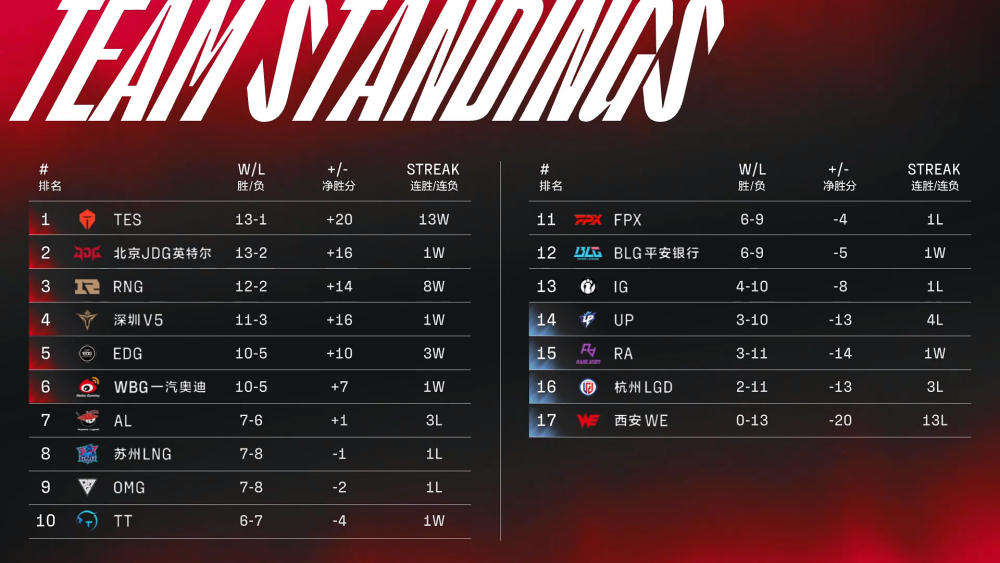 AL更惨,后面的三支队伍,分别是JDG、EDG和TES,这三支队伍光是看着就让人害怕,虽然目前他们7-6,但是这也只是暂时的,可能最终还是会以7-9的战绩结束自己的常规赛之战。如此一看,这个季后赛可能会出现5支7-9的战队,突围真的是太伤脑筋了,这5支战队里面,必会出局两支甚至三支队伍,不知道大家觉得,最终会是谁最终进入到季后赛呢?