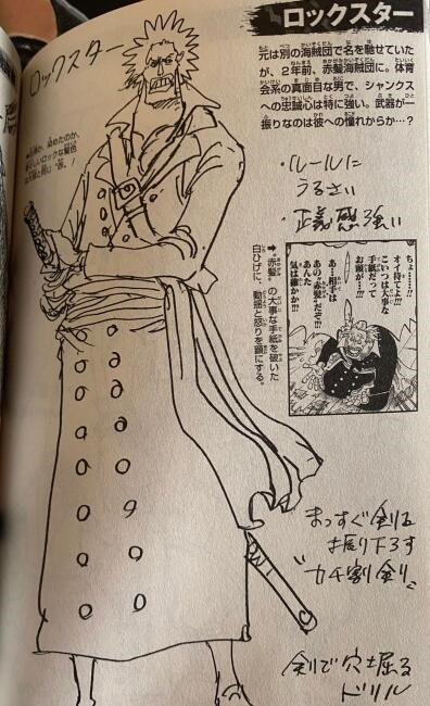 最后一位就是洛克之星,当初给白胡子送信的小弟。两年前这家伙还是新人,如今也跟干部平起平坐了。洛克之星是红发的小迷弟,头发和红发一样,都是红色,不知道是不是故意染的。武器是剑,喜欢用剑当钻头来挖洞,可能是天元突破看多了。