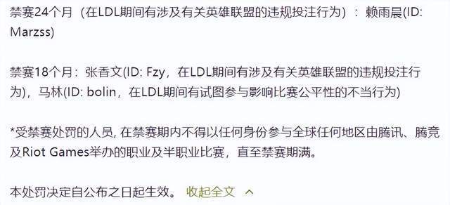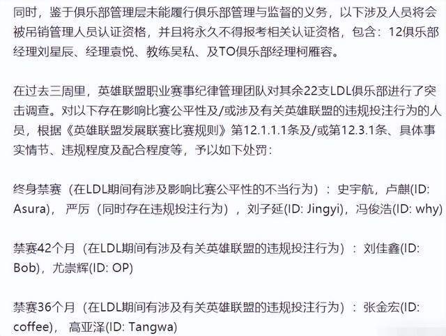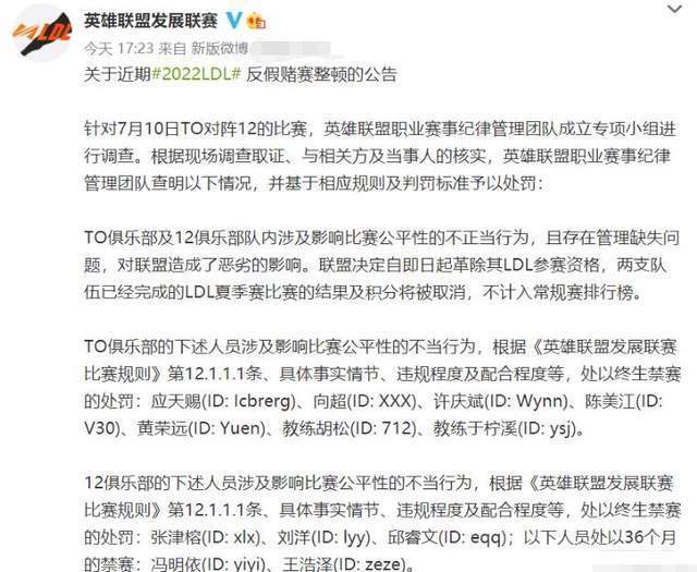 这次事情是这样的,官方突然发布了一篇长文,内容中提到TO和12的比赛,经过专项小组的调查和取证后,确定这两队都存在影响比赛公平性的不正当行为,因此将取消这两支战队的参赛资格。然后对TP战队的5位队员以及2位教练进行惩罚,全部终生禁赛,还有12战队的3位队员也是终生禁赛,另外2位队员禁赛3年。