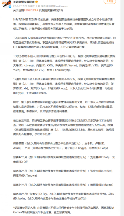本次LPL官方公布的制裁名单中有三名选手被终身禁赛,其中就有大家熟悉的京一,两名选手被禁赛42个月,另外五名选手也是受到不同程度的禁赛,不过最关键的是TO和12这两个俱乐部被取消LDL参赛资格,对于这两个队伍已经获得的积分不计入常规赛排行榜,说实话很多观众都没想到腾竞会这么狠,连人带俱乐部都给抬下去了,不过知道真相之后也可以理解,是个人有九个选手打假赛,两个教练也是参与者,这要是不把整个队伍都抬下去根本解决不了问题,而且这些选手太明显了,领先一万五的经济加上大龙和土龙魂,这些选手根本不具备职业素养。