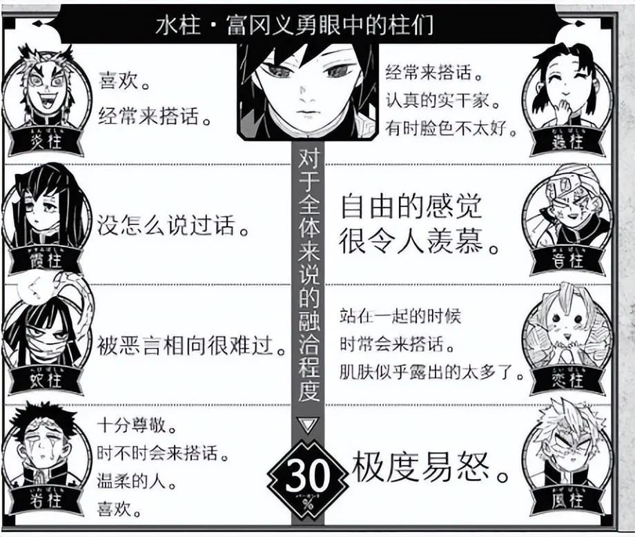 因为过往的经历,富冈义勇在很长一段时间里面封闭自己,尽管自己的实力已经在长期的战斗中达到了柱的水平,但他还是不愿意承认,认为自己根本达不到柱的标准,大概也因为这样,义勇并没有过多地和柱们接触,不过对于柱们义勇也是有自己的看法,在《鬼灭之刃》公式书中就讲述了义勇眼中的九柱是什么样子的