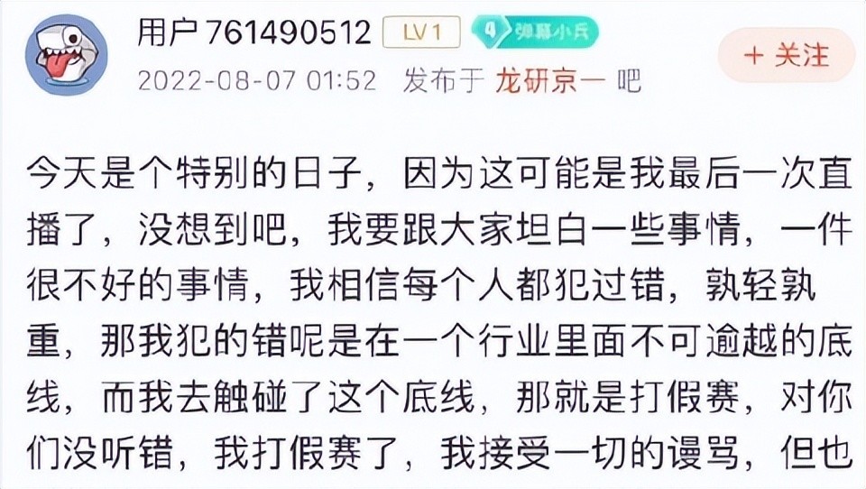 但他现在却也和职业联赛选手没了多大关系了,如今假赛风波传出可能会给他如日中天的直播生涯造成比较大的影响,他本人也是在鱼吧中回应自己打假赛以后的心路历程,诉说着自己后悔不已的悔恨情绪。