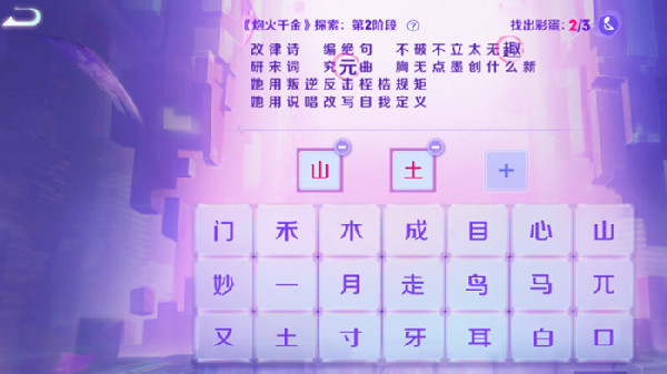从给出的文字池中,选择2~3个字,进行“合”或“拆”的操作,拼组成上方歌词段落中的文字,即找到彩蛋。