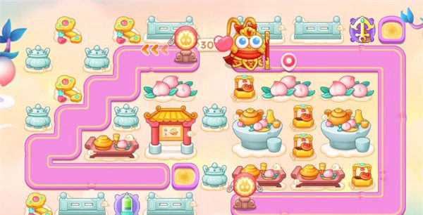 1、在右上角传送门的旁边空位放置火瓶,升2级,锁左下角的蟠桃,左上角两个如意中间的空位放置毒针,升满级,第一波会有滑板兔,速度很快,三级毒针正好能解决。