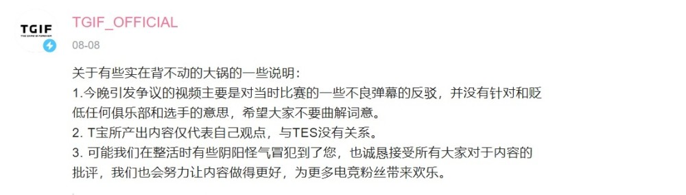 TGIF发布的那个动态也是被喷了,运营表示说引发争议的视频,主要是对当时比赛一些不好弹幕的反驳,并没有针对和贬低俱乐部的意思,然后和TES撇清关系,并且在最后一部分表示在之后会诚恳地接受大家的批评。