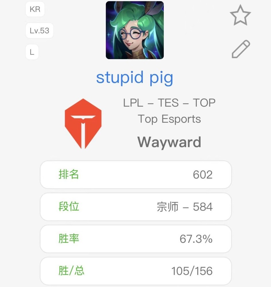 wayward最新的韩服ID如下,改为了Stupid pig,翻译过来就是蠢猪的意思。因为是输给V5后更改的,再加上他自己在比赛中确实两场都没有打好,所以很多人认为这是对自己赛场发挥的吐槽,wayward也觉得输给V5,自己有很大的责任。