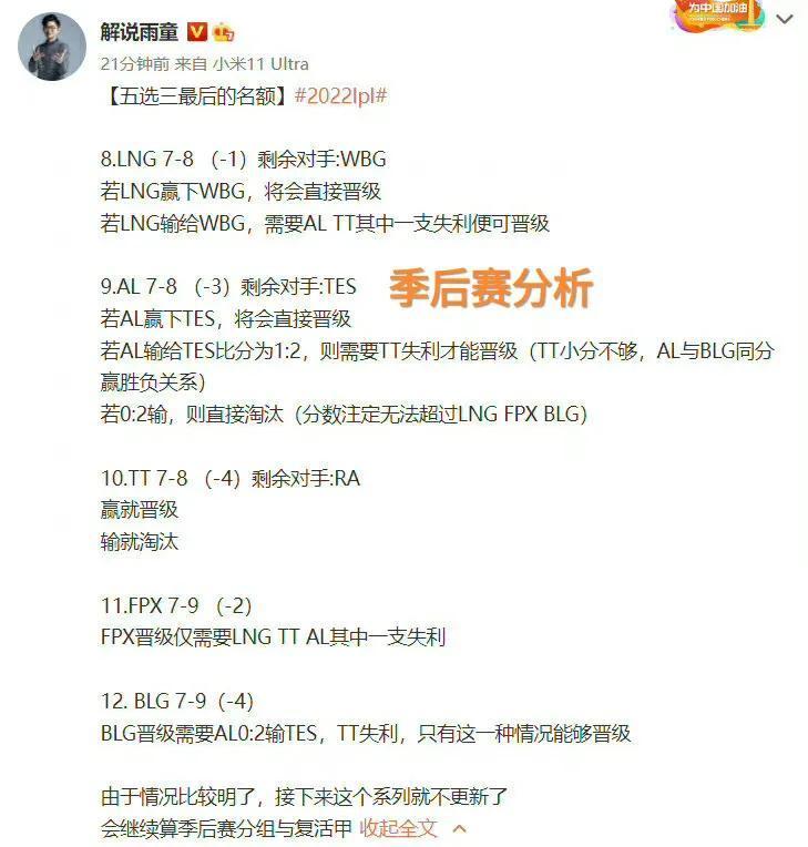 到了最后时刻,没想到lpl赛区还是这么精彩,对比一下lck赛区夏季赛的常规赛还没有结束,他们的季后赛名额就已经全部产生了,比赛几乎没有任何的悬念。当然感觉lpl赛区目前季后赛的队伍数量有些多了,说实话。之前的八支战队还是比较合适的,多的几支战队完全就是一轮游的经验宝宝,为lpl徒增一些比赛的压力。