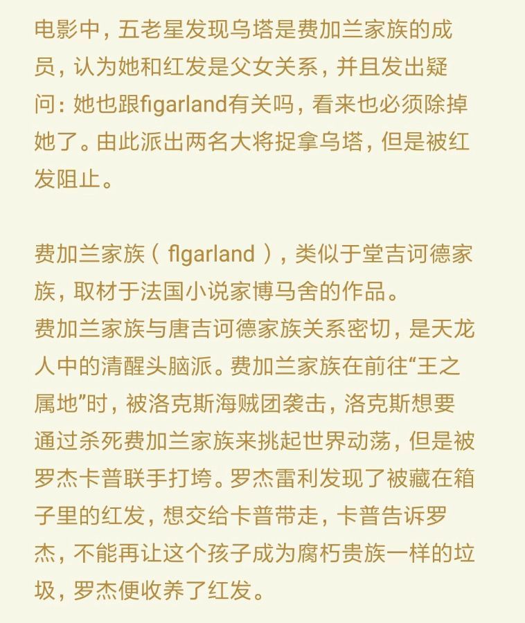 《40亿卷》是尾田老师特别为剧场版编辑的资料集,里面有着很多重要的信息,其中就包含红发的设定,原来红发的全名是“费加兰·香克斯”,家族名就是费加兰。在《RED》剧场版中,五老星因发现乌塔是费加兰家族的人,认为她与红发是父女关系,所以派出两位海军大将抓捕乌塔,不过被红发出手制止。