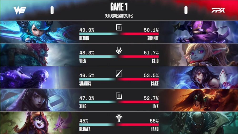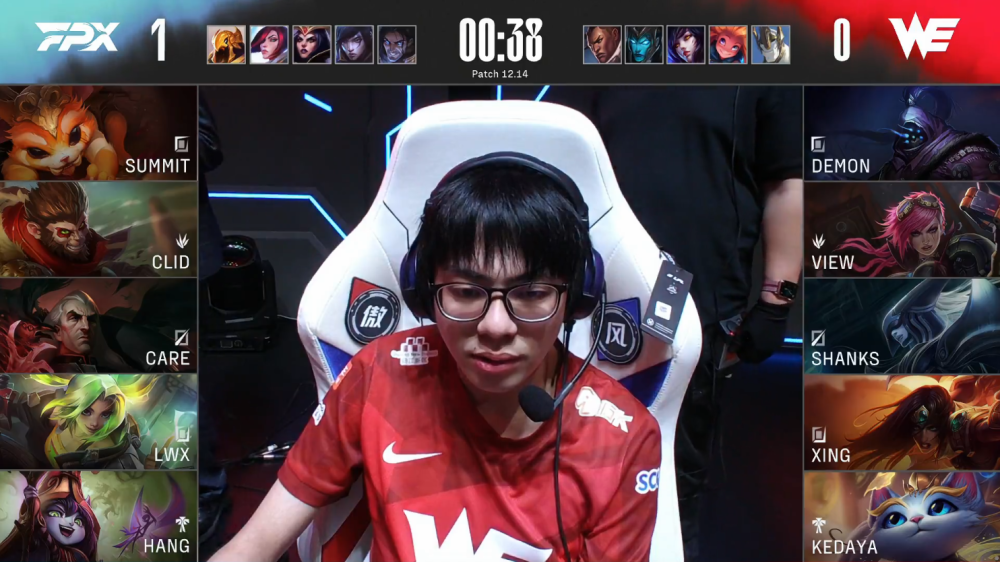 第一局比赛,WE蓝色方,禁用卢锡安,猫咪,岩雀,寒冰,纳尔,选用Demon格温、View巨魔、Shanks瑞兹、Xing厄斐琉斯、Kedaya璐璐;FPX红色方,禁用塞拉斯,泽丽,滑板鞋,妖姬,沙皇,选用Summit凯南、Clid波比、Care阿狸、Lwx希维尔、Hang派克。