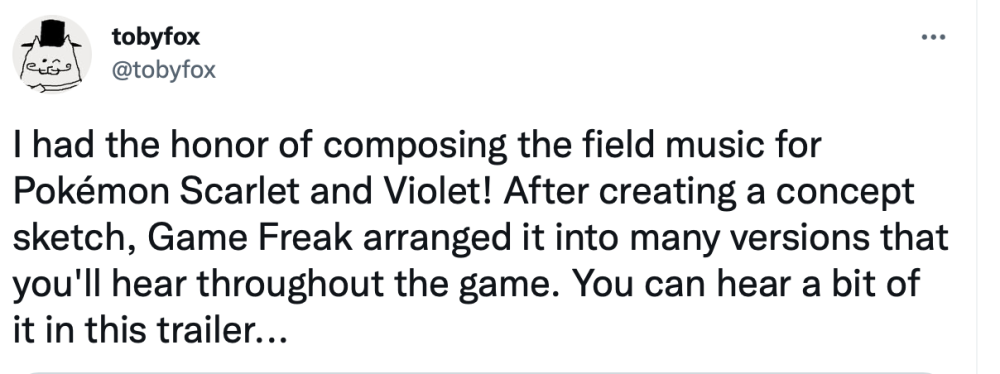 其实 Toby Fox 已经与 Game Freak 在多个游戏项目上有过合作。Fox 曾经为 Game Freak 的 RPG 游戏《小镇英雄》创作了音乐,还为《宝可梦 剑/盾》中的对战塔谱写了主题曲。早在今年六月,Toby Fox 就在推特上确认,自己将为这部《宝可梦》新作创作音乐。
