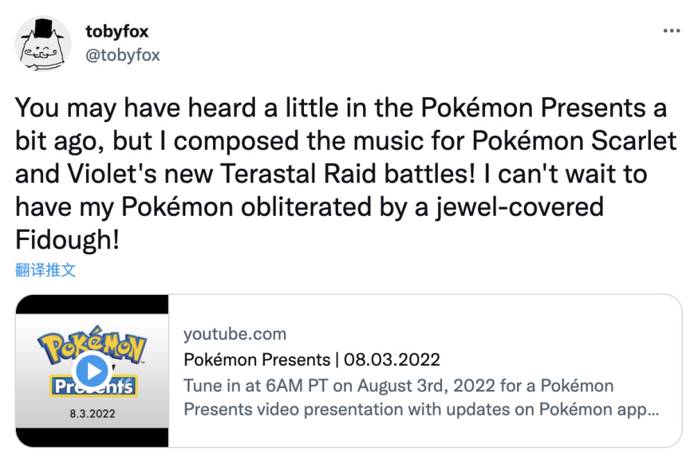 《地下传说》制作人 Toby Fox 今日发推表示,《宝可梦 朱/紫》中「太晶团体战」的背景音乐是其创作的。而且在先前的宝可梦发布会中,Fox 所创作的部分音乐就已经亮相。
