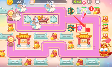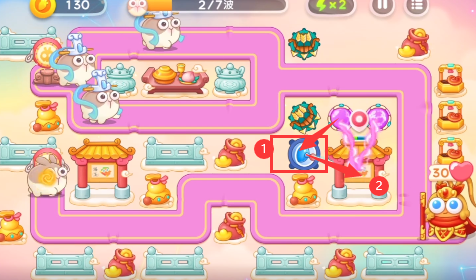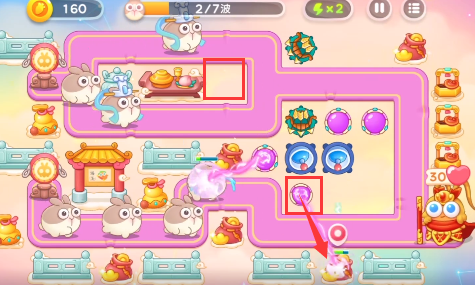 6、放置炮塔如图所示,在后排一定提前放置一个泡泡塔不然可能拦不住仙女兔,其它位置放输出即可。