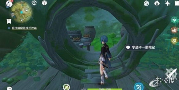 进洞之后任务会提示解救兰那罗,把底下这个蓝色蕈兽击败,兰那罗会自己下来,然后与兰沙恭对话。对话后提交花朵护身符,再与兰沙恭对话。对话完可以顺便拿一个草神瞳,就在大蘑菇的顶上。(在蘑菇的背面,有一根树根,沿着他爬上去到一个蘑菇顶上,向草神瞳那里看,有四叶草可以直接过去,如果有万叶或温迪的就无所谓了,直接飞不解释。)