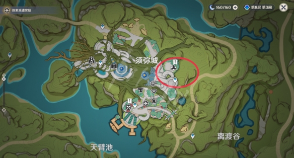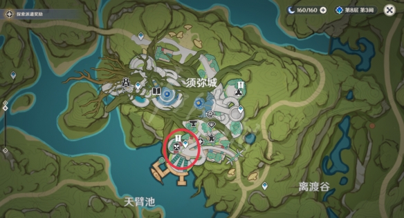 接着传送到须弥城右边的锚点,在教令院联络官所在房子的上方是第二个,也就是咱们平常完成任务升级声望的那个位置。