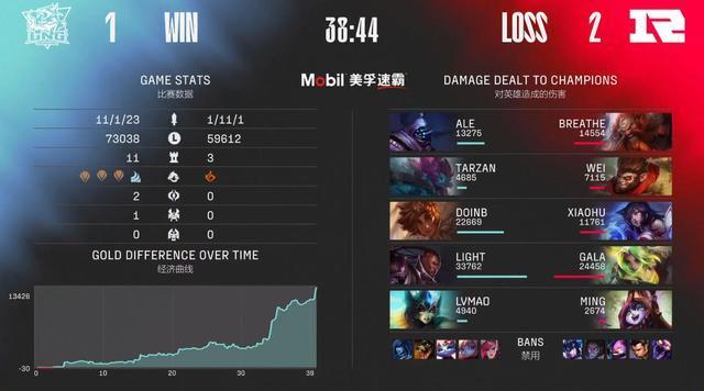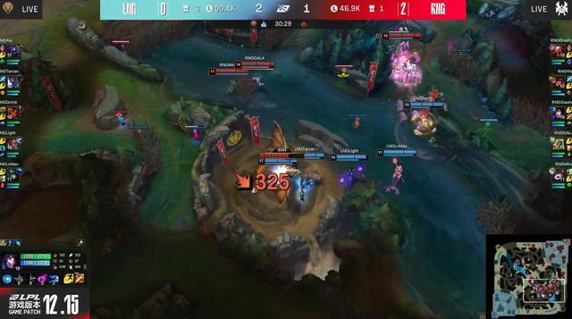 34分半,Light神装卢锡安骑脸一套直接秒掉璐璐,LNG拿到人数优势连续拔掉RNG中下两路高地,转头收下土龙魂,经济差拉开到1W,基本已经奠定胜局。