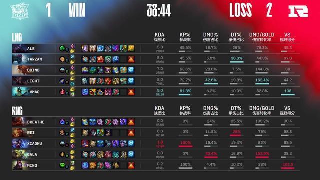 32分钟,RNG大龙附近的蹲伏探草的却是RNG完全动不了的武器,LNG顺势开启团战,四件套的卢锡安像个战神,连续完成追击带队打出一波0换3完胜收下大龙。