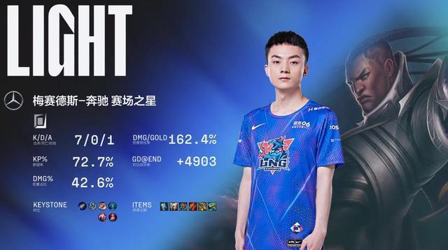 赛后数据,Light送出全场最高的输出,发育良好的卢锡安中期统治力十足。