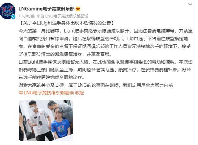 幸好,LNG带的康复师经验丰富,几分钟就帮light解决了身体上的问题,他可以继续上场。LNG发文之后,有粉丝质疑现场灯光师:因为他们随便乱照的灯光秀,导致light的眼睛出了问题。